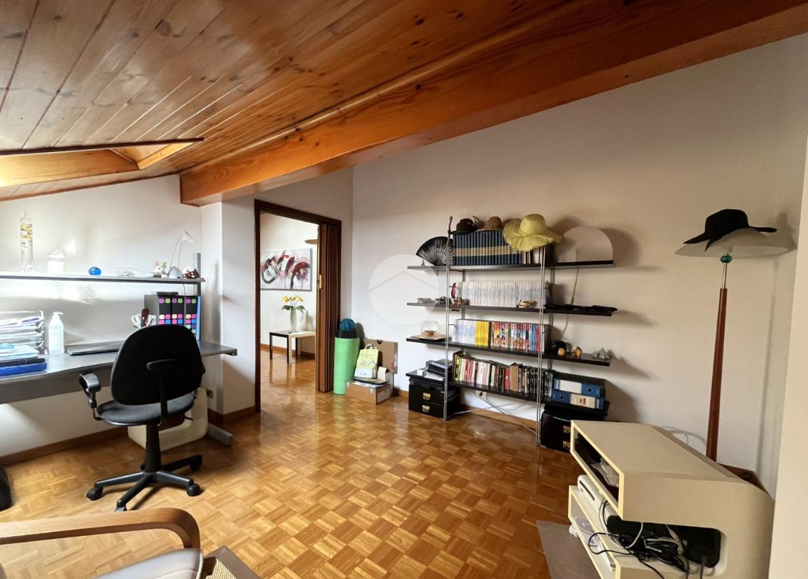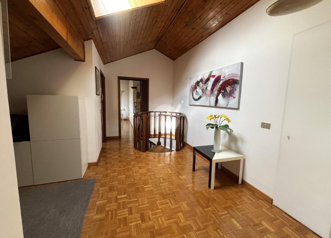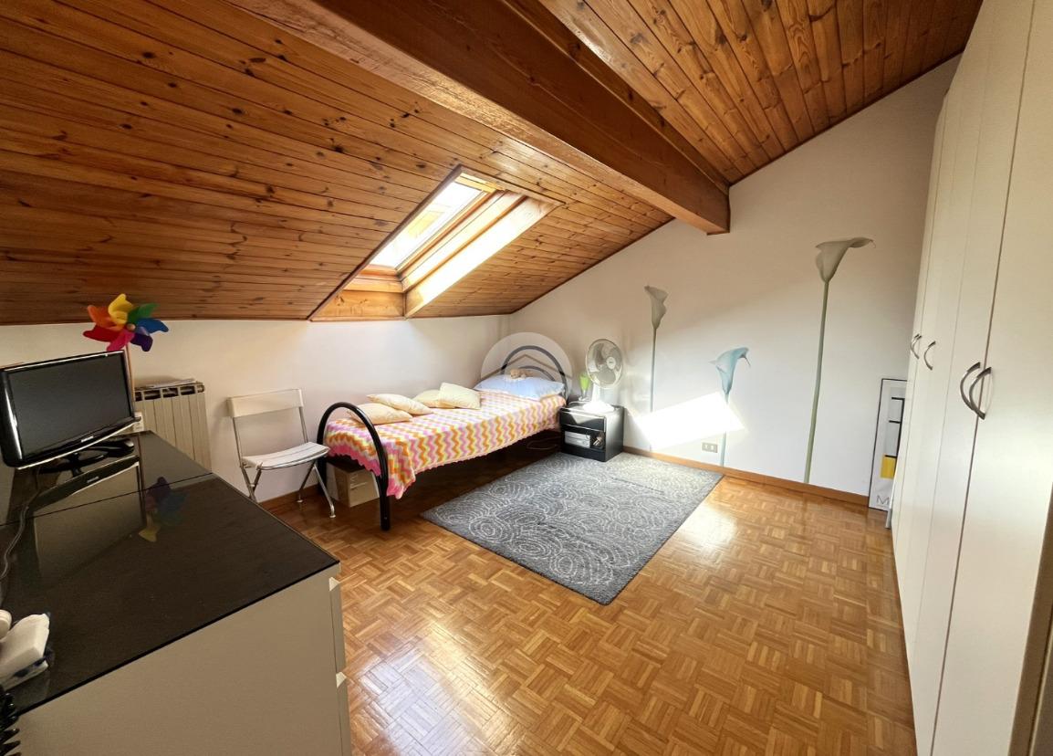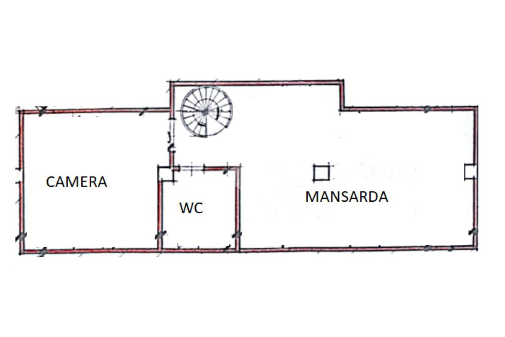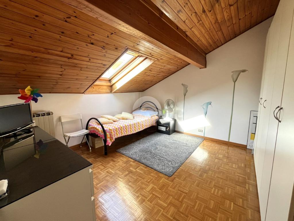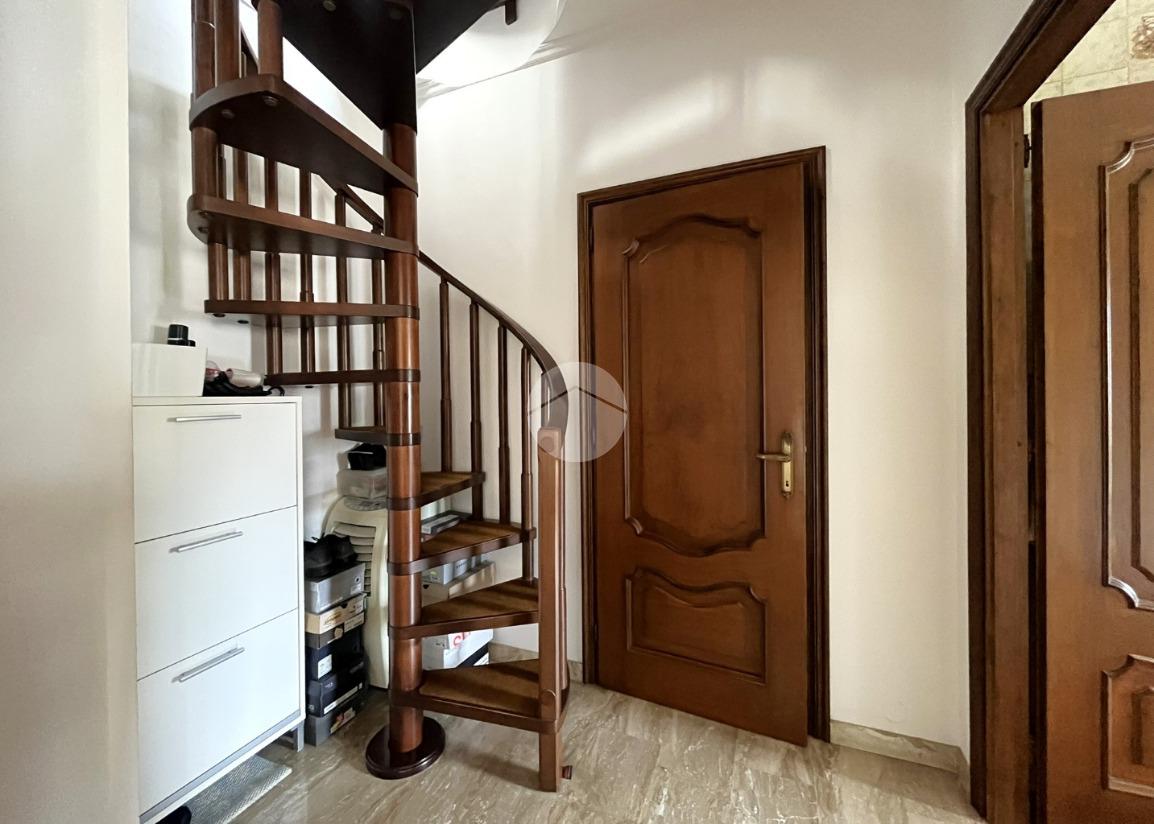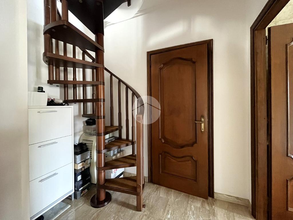 L'immobile, di circa 100 mq calpestabili, è posto su due livelli: il piano principale (piano secondo della palazzina) è composto da ingresso, cucina abitabile, ampio soggiorno, camera matrimoniale, bagno con doccia e vasca, due balconi e disimpegno con scala a chiocciola che porta al piano mansardato. Al piano superiore, un bagno di servizio, e due camere.