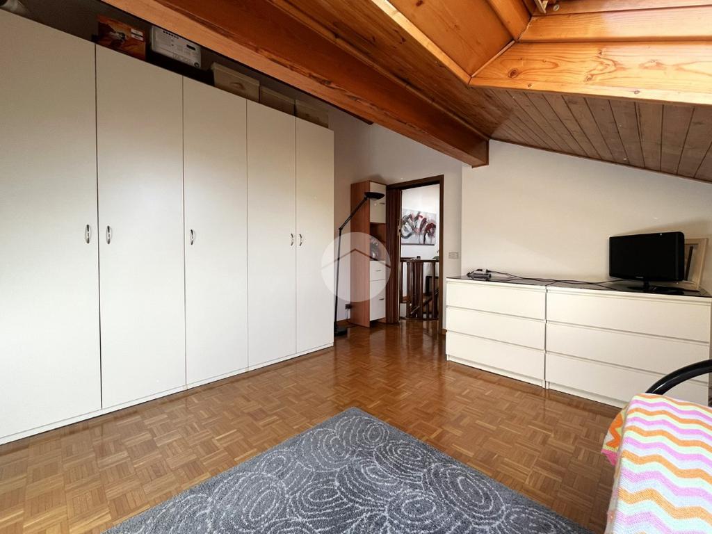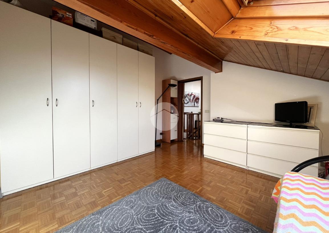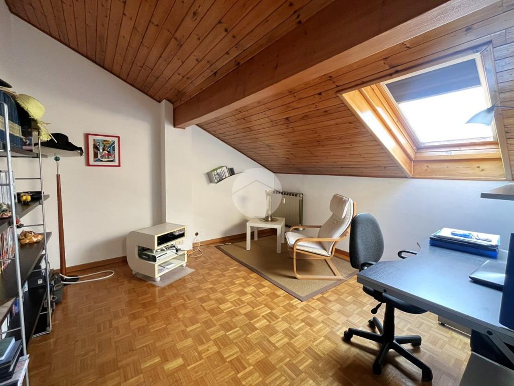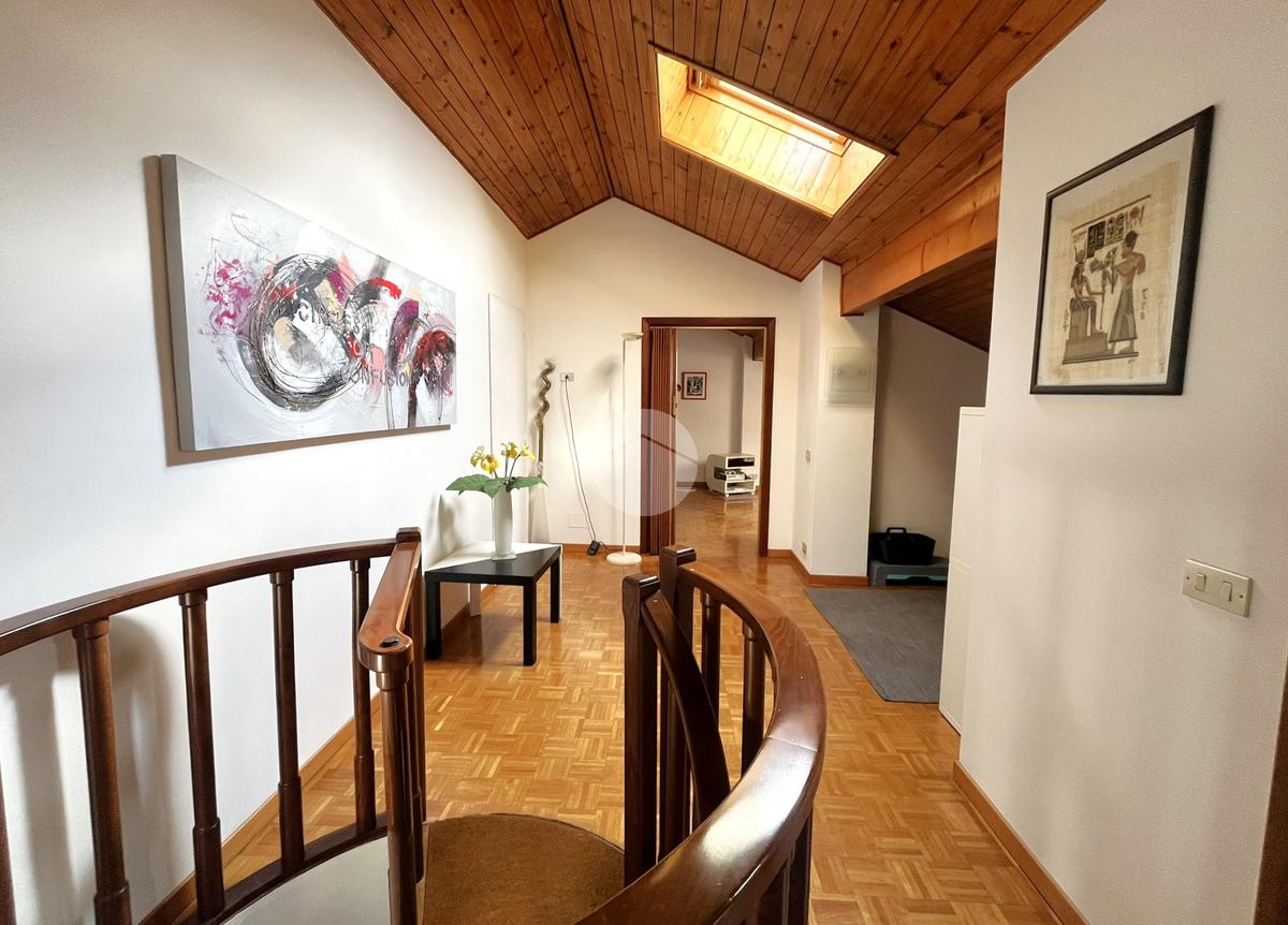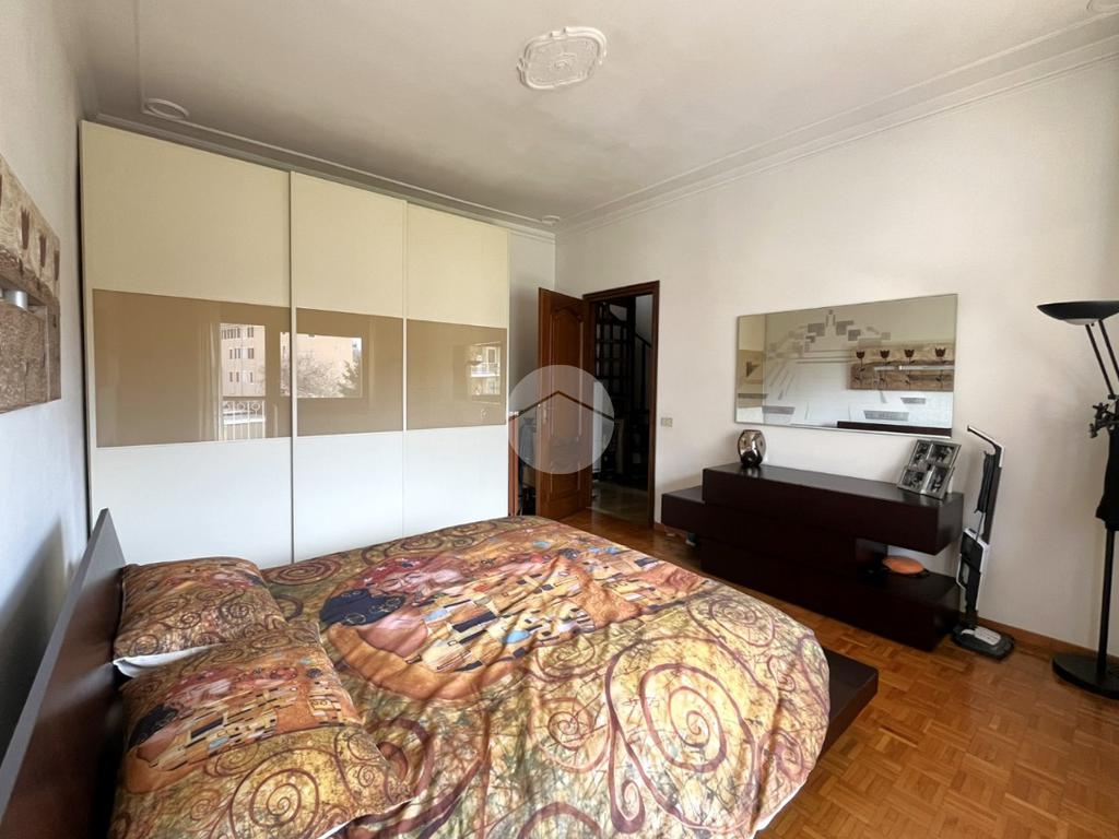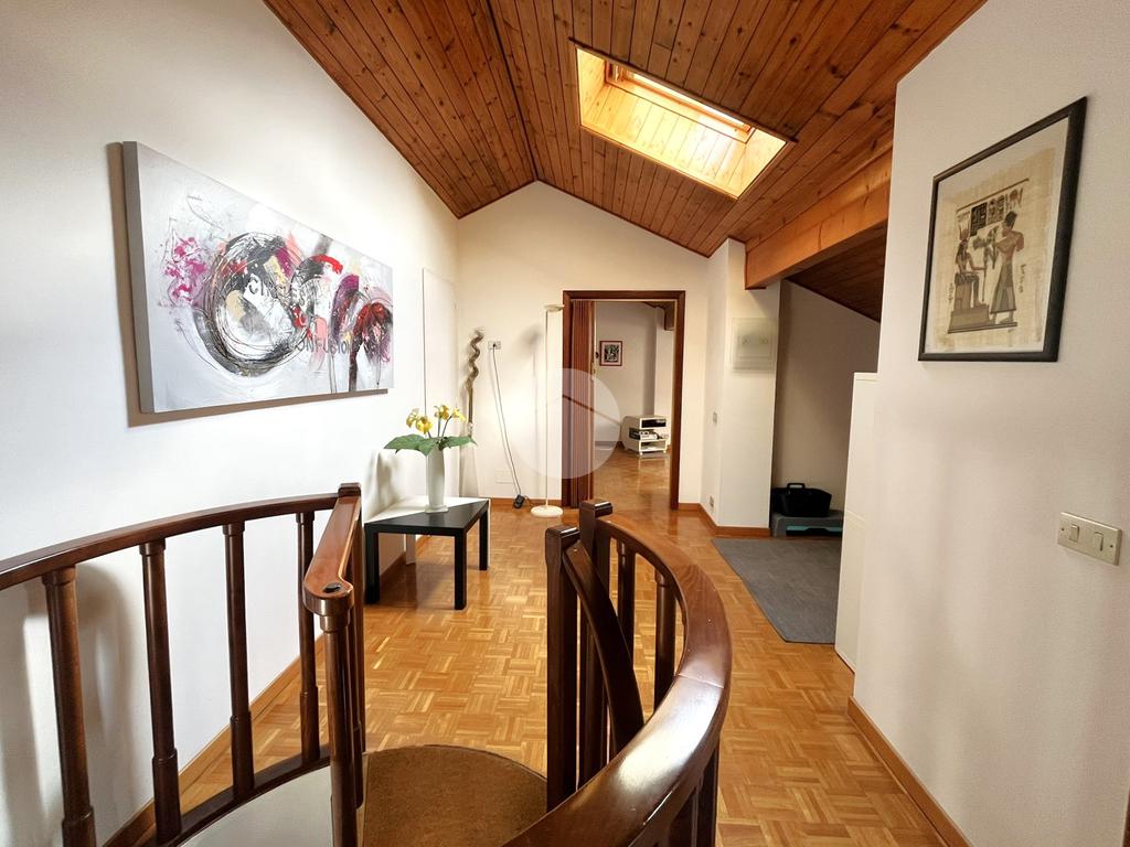 L'immobile, di circa 100 mq calpestabili, è posto su due livelli: il piano principale (piano secondo della palazzina) è composto da ingresso, cucina abitabile, ampio soggiorno, camera matrimoniale, bagno con doccia e vasca, due balconi e disimpegno con scala a chiocciola che porta al piano mansardato. Al piano superiore, un bagno di servizio, e due camere.